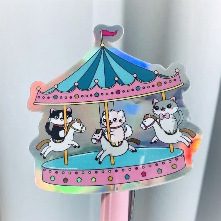 Carousel Ride with Flora, Lily and Bud Holographic Vinyl Cat Decal Die Cut Sticker