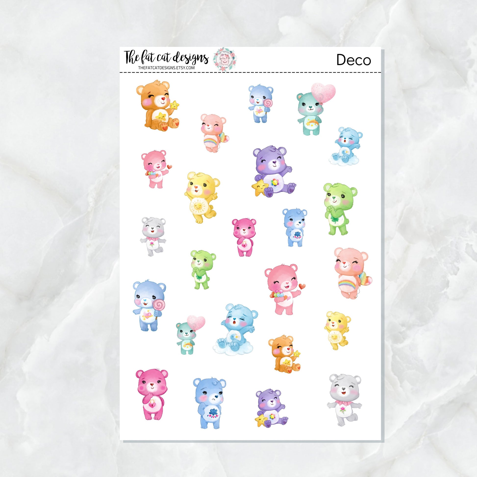 Sheet includes 2 of each bear 24 stickers total, smaller stickers measure .75 inches tall, larger stickers measure 1" tall