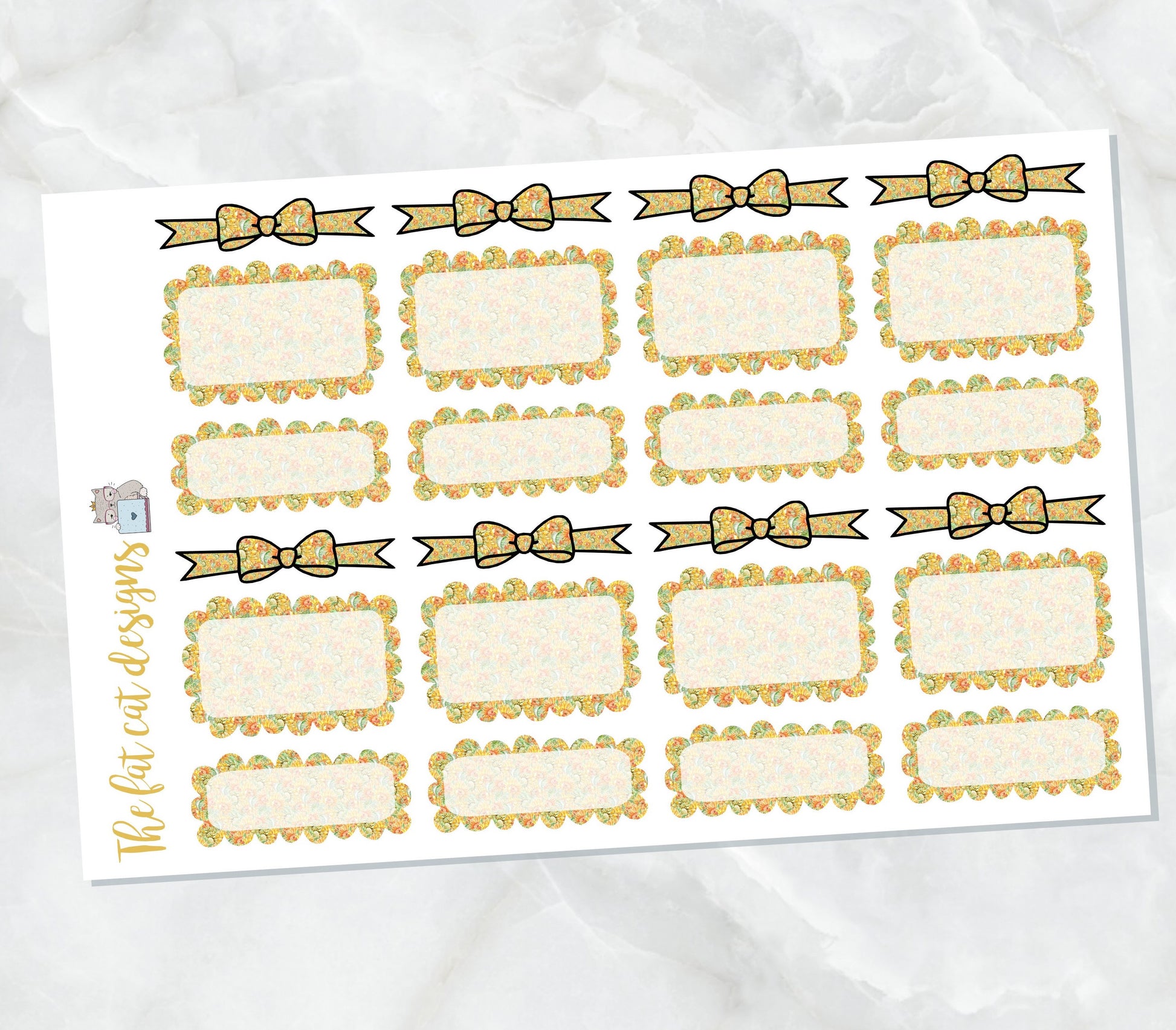 Each sheet includes 8 decorative bow headers, 8 scalloped half boxes and 8 scalloped quarter boxes